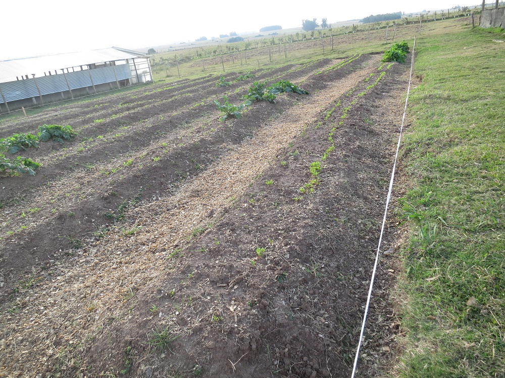 Due to the wind the trellis supports are fairly well interred – end posts with buried dead heads, three posts in the row, three rows of taunt wire, four foot stakes well-hammered and tied to the cross wires – in a hope of helping the tomatoes flourish despite our constant wind.